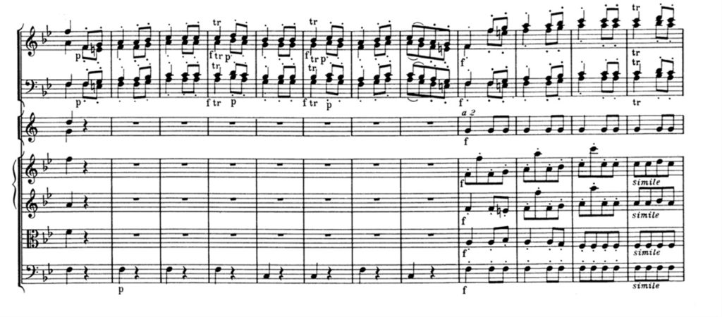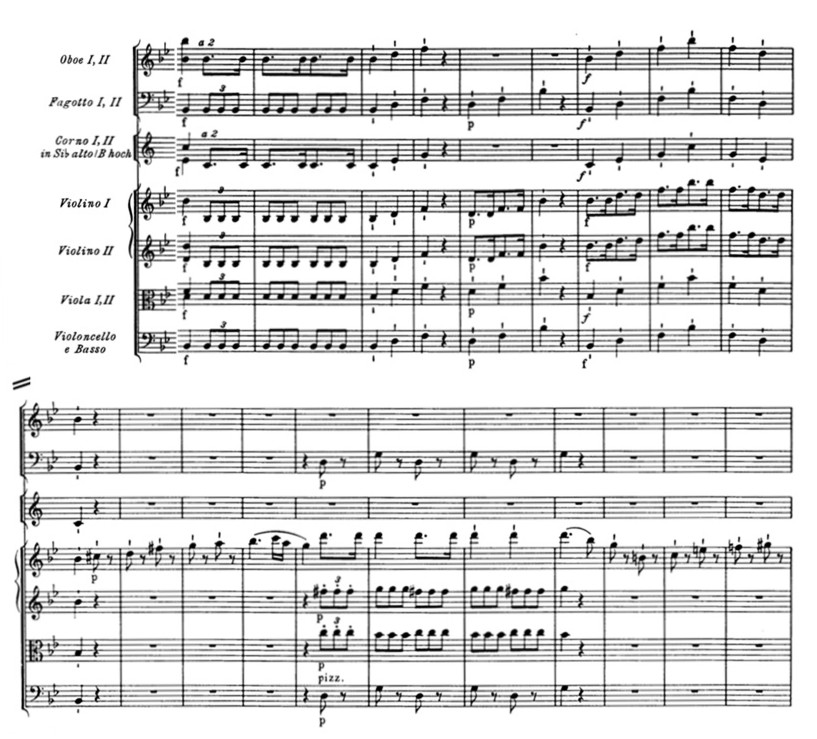 と、提示部を、また特に木管の提示するクロージング主題を特にブッファ的であると聴きとっている。変ロ長調のブッファ調器楽曲では木管が大きな役割を果たすのだ。