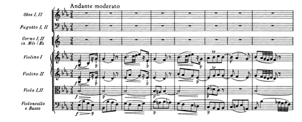 では、そのモデラート追記が意味する音楽的特性は何なのだろうか。私はこれこそ変ロ長調ブッファ調器楽曲に特有な、必然的に変ホ長調となる緩徐楽章が示す一種の敬虔さ、瞑想性などといったものだろうと思う。ラールセンはこのアンダンテ・モデラートについて、